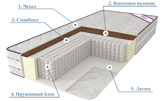 2. Кокосовое волокно (1 см). Природный экологически безопасный материал. Он очень плотный, прочный и в то же время эластичный, в связи с этим обладает хорошими ортопедическими характеристиками. Поддерживает здоровый микроклимат спального места — обладает высокой воздухопроводностью, способствует нормальной терморегуляции и не впитывает воду.