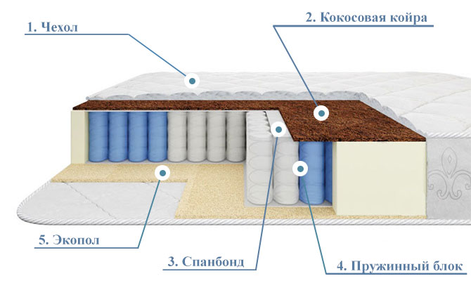 1. Чехол. Выполнен из хлопковой ткани, стежка - ультракомфорт. Приятный к телу материал обладает высокой износостойкостью, защищает матрас от загрязнений и пыли.