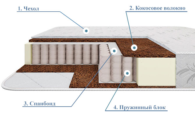 - Кокосовое волокно (9 мм). Природный материал с добавлением натурального латекса обладает высокой эластичностью, за счет которой ортопедические свойства матраса увеличиваются в разы. Кроме этого наполнитель не впитывает влагу, улучшает воздухообмен, препятствует появлению клещей и прочих микроорганизмов.