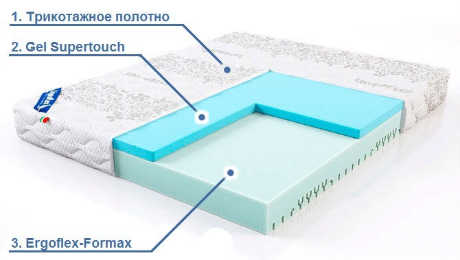 2. GEL Supertouch. Слой инновационной пены обладает эффектом памяти, легко и быстро повторяет форму тела. Обладает термочувствительными и терморегуляционными свойствами. Благодаря этим качествам матрас всегда обеспечивает комфортную для владельца температуру. Излишнюю поглощает летом, а в холодное время года сохраняет ее.