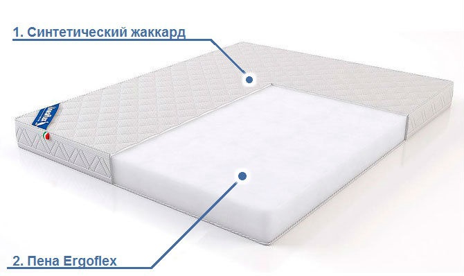 - Пена Ergoflex (14 см). Благодаря ее высокоэластичности и стойкости к деформации, матрас сохраняет форму весь срок своей службы и не проседает. Ячейки пены с повышенной плотностью равномерно распределены по всей площади, что позволяет расслабить каждый участок вашего тела.