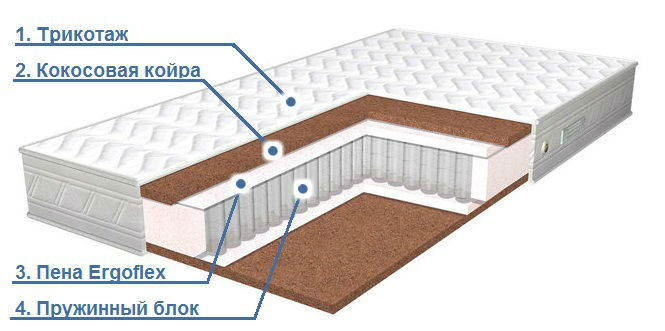 2. Кокосовая койра (2 х 3 см). Натуральный материал, изготовленный из кокосовых волокон и пропитанный латексом, дает потрясающее сочетание прочности, упругости, влагостойкости и воздухопроницаемости. Это экологичный и эластичный наполнитель, отвечающий за сохранность вашей осанки и правильное положения позвоночника во время сна.