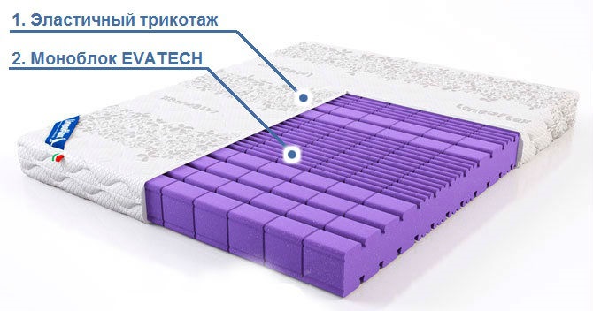 2. Моноблок EVATECH. Микроструктура полиуретановой пены похожая на очень маленькие пружинки. Перфорация из 7 зон обеспечивает правильное распределение воздействия на участки тела. Таким образом достигается расслабление всех мышц, вы почувствуете как восстановились силы даже после непродолжительного сна.