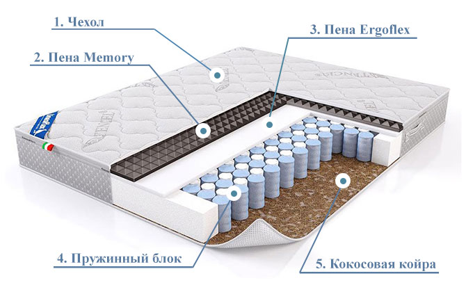 3. Пена ERGOFLEХ (3 см). Для обеспечения высокого уровня комфорта используется дополнительный слой высокоэластичной недеформируемой пены. Материал безопасен для здоровья — не токсичный и гипоаллергенный. Он уменьшает нагрузку на сосуды за счет правильного распределения давления на различные участки тела, уже через неделю вы почувствуете, как улучшается самочувствие после сна.