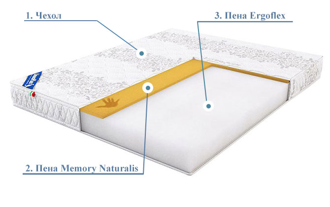 - Пена Memory Naturalis. Последняя разработка итальянских ученых позволила создать вязкий и одновременно эластичный материал. В его составе много растительных компонентов, поэтому он не раздражает кожу и не вызывает других видов аллергии. Обладает эффектом памяти, легко повторяет все контуры человеческого тела. Обеспечивает ощущение невесомости, благодаря которому вы легко и быстро погружаетесь в сон.