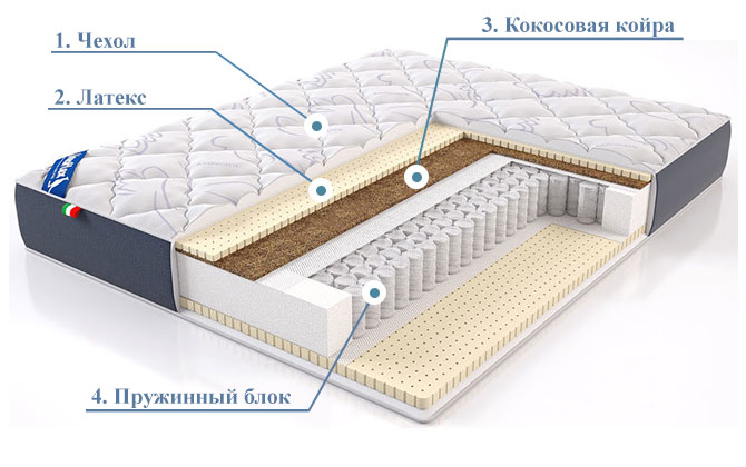 4. Блок независимых пружин. Повторяет линии вашего тела и гарантирует правильное положение позвоночника во время сна. Наполнители естественного происхождения – кокосовая койра и латекс – слажено работают с пружинами и делают отдых максимально комфортным.