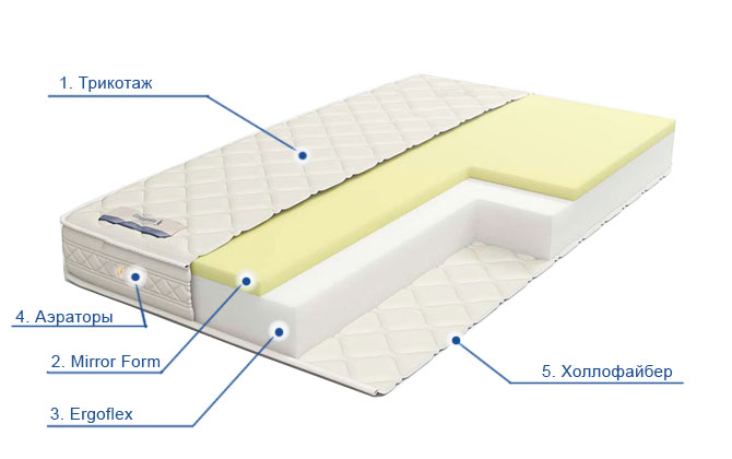 - Пена Ergoflex (14 см). Обеспечивает точечную поддержку ваших мышц, снимает тонус и напряжение нервной системы, так как ваш опорно-двигательный аппарат всю ночь находится в правильном и расслабленном положении.