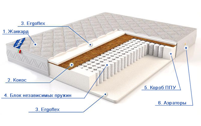 • Продуманный состав. Взаимодействуя с наполнителями, пружинный блок обеспечивает полноценный отдых и профилактику болей в спине и шее. Вы избавляетесь по утрам от чувства, будто всю ночь разгружали вагоны.