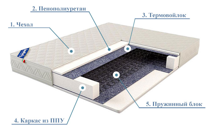 3. Термовойлок. Нетканый материал, состоящий из синтетических и шерстяных волокон. Равномерно распределяет нагрузку на пружины, одновременно защищая слои матраса от блока. Повышает уровень комфорта, не влияя на степень жесткости матраса.